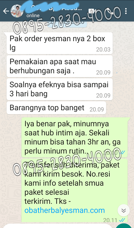 Jika ada pertanyaan lebih lanjut seputar obat kuat alami YESMAN maupun seputar keluhan anda, bisa langsung klik tombol WA atau telp dengan nomor contact 089528304000